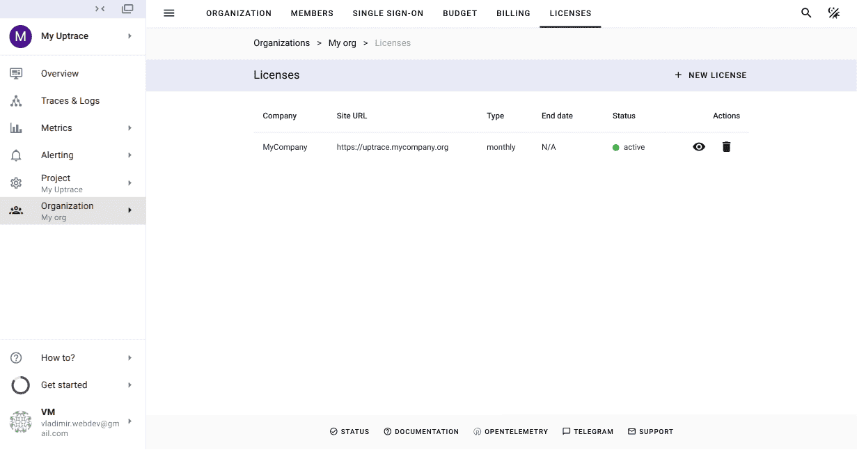 Please note that both license types are tied to the specific domain you provide during license creation. This domain will automatically override the site.url setting in your Uptrace configuration.